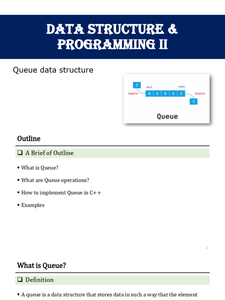 ▪ A queue is controlled by two main operations which implement the FIFO method
