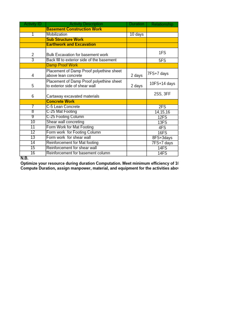 Compute Duration, assign manpower, material, and equipment for the activities above.