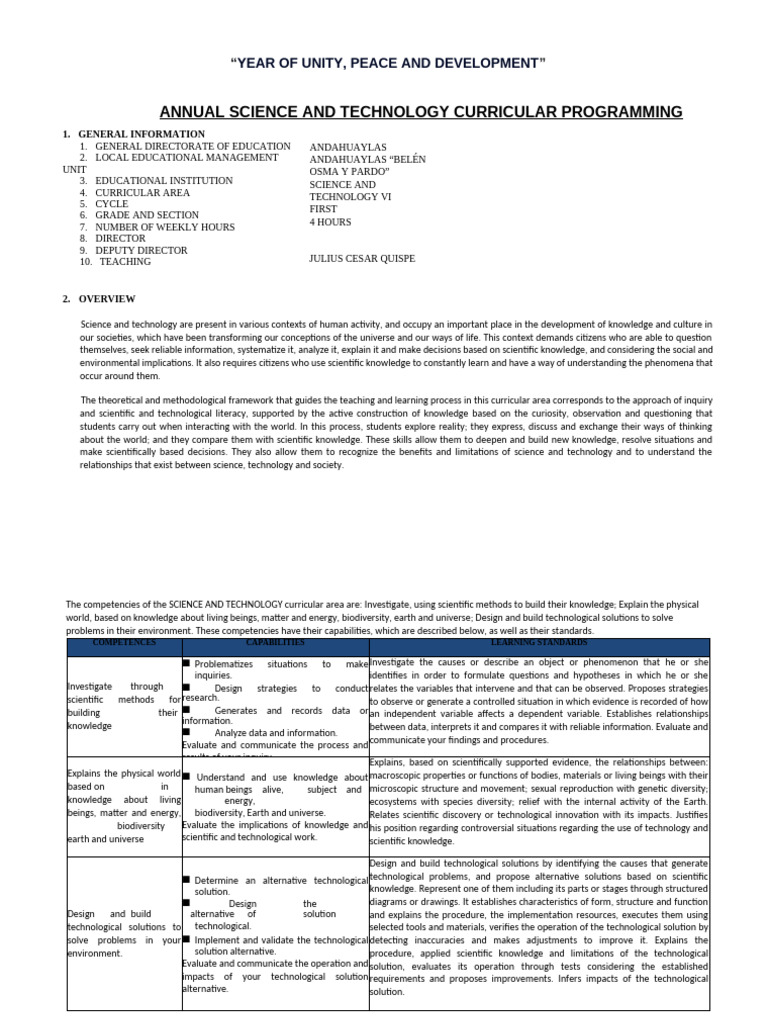 The competencies of the SCIENCE AND TECHNOLOGY curricular area are: Investigate, using scientific methods to build their knowledge; Explain the physical