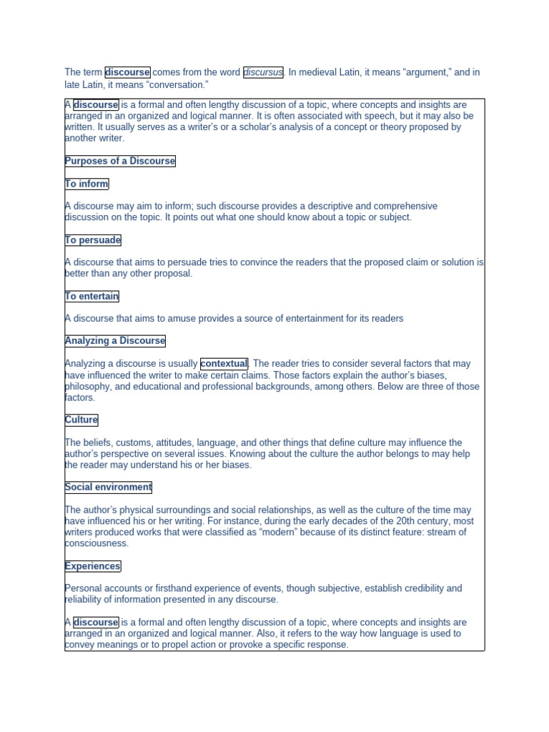 Also, the writer mentions the objectives of the discourse and how it may be beneficial or detrimental.