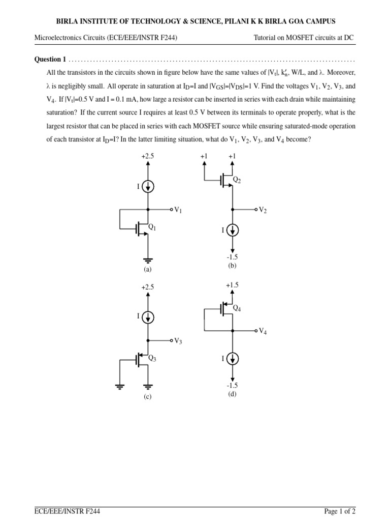 Microelectronics Circuits (ECE/EEE/INSTR F244) Tutorial on MOSFET circuits at DC