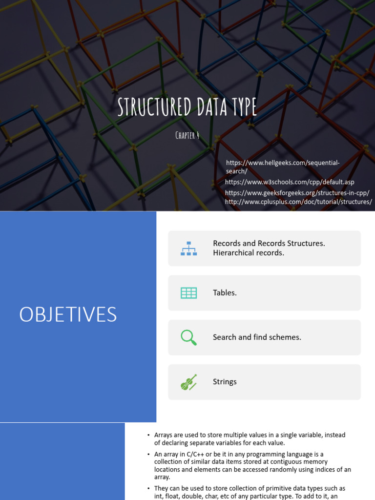 • Because structures are types, they can also be used as the type of arrays to construct tables or databases of them: