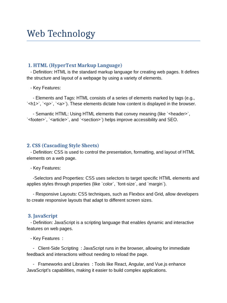 - Elements and Tags: HTML consists of a series of elements marked by tags (e.g.,