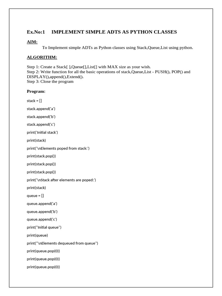 To Implement simple ADTs as Python classes using Stack,Queue,List using python.