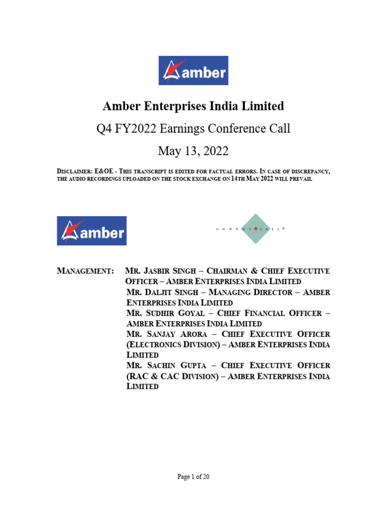 Call of Amber Enterprises India Limited. This conference call may contain forward looking
