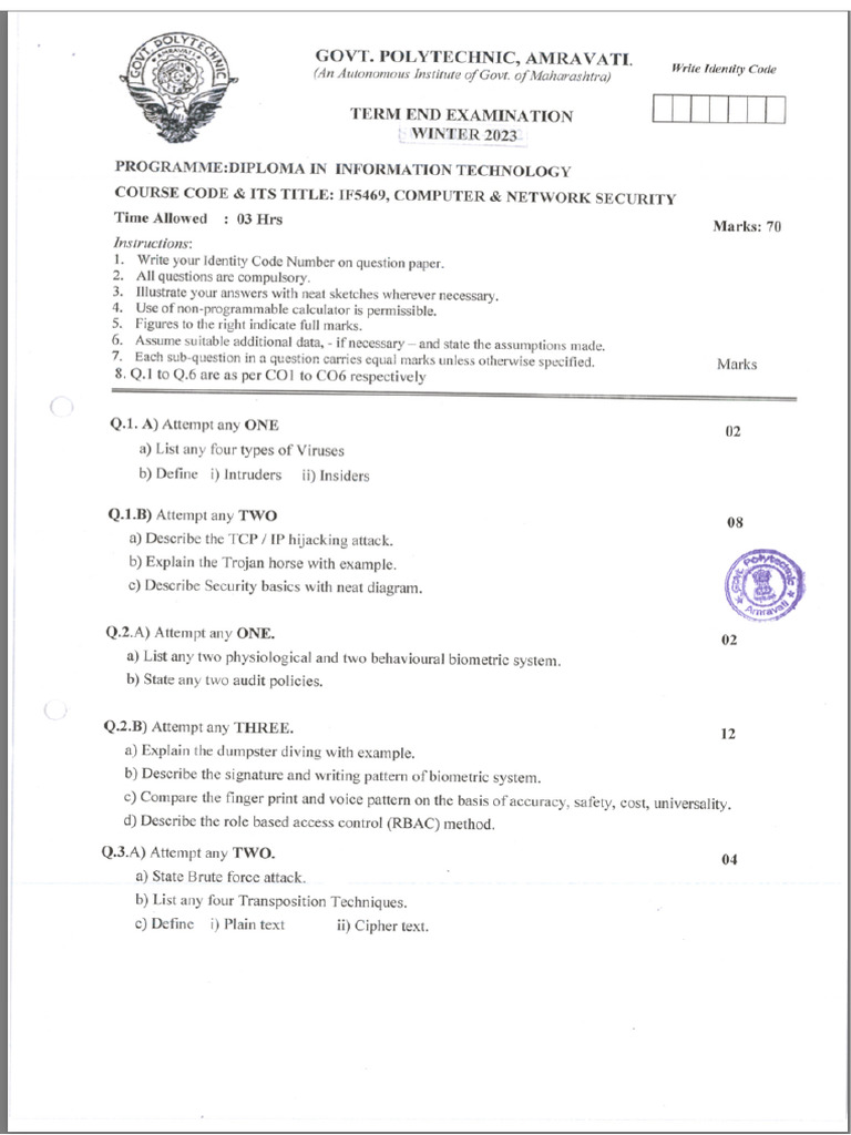 The document outlines the examination structure for the Diploma in Information Technology course, specifically focusing on Computer and Network Security. It includes instructions for students, a breakdown of questions across various topics such as viruses, biometric systems, cryptography, and intrusion detection systems, as well as the marks allocation for each question. The exam format emphasizes the importance of neat sketches, assumptions, and the use of non-programmable calculators.