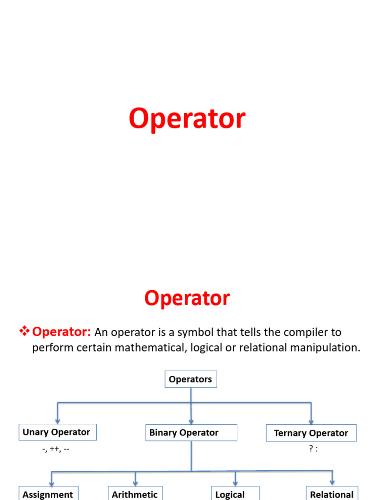 Key unary operators are – (negation), ++ (increment), -- (decrement)