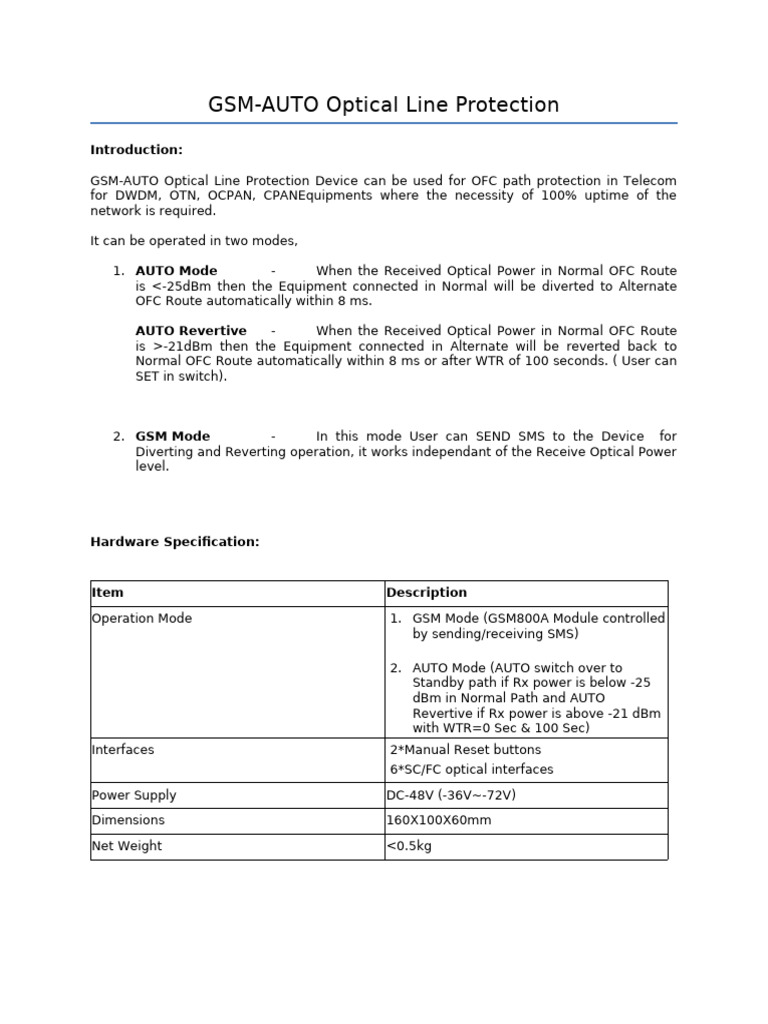 GSM-AUTO Optical Line Protection Device can be used for OFC path protection in Telecom