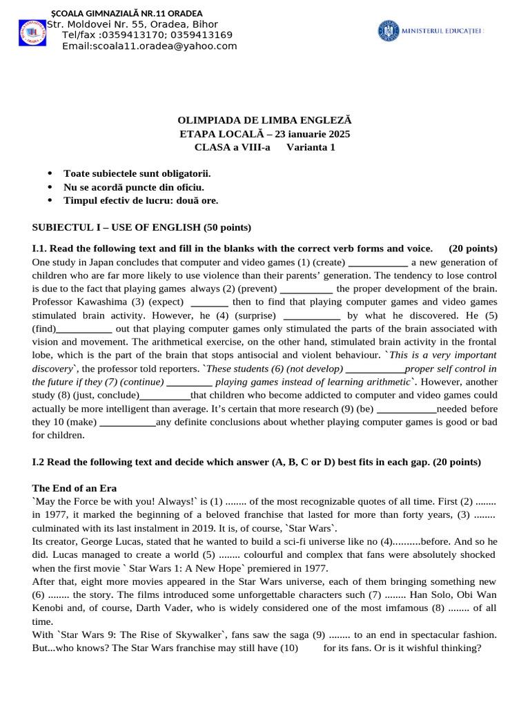 SUBIECTUL I – USE OF ENGLISH (50 points)