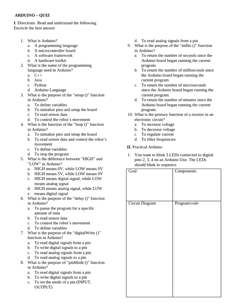 1. What is Arduino? d. To read analog signals from a pin
