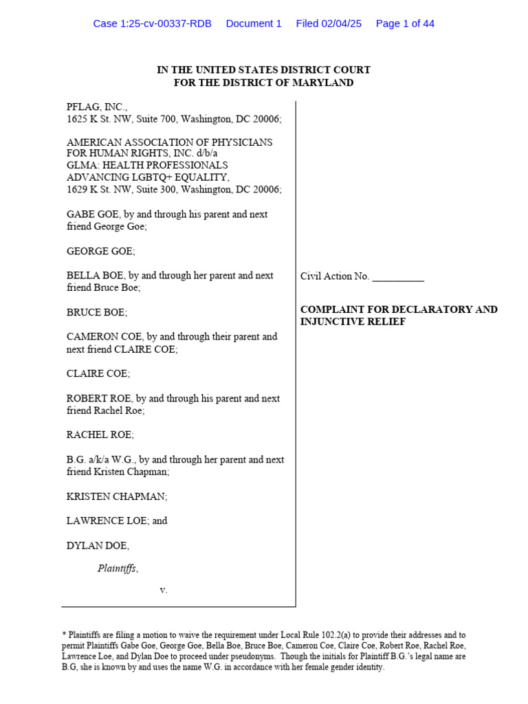 Plaintiffs”), Plaintiffs Lawrence Loe and Dylan Doe (the “Adult Plaintiffs”), and certain PFLAG