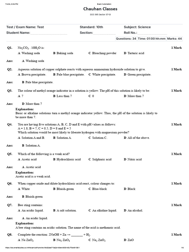 Test / Exam Name: Test Standard: 10th Subject: Science