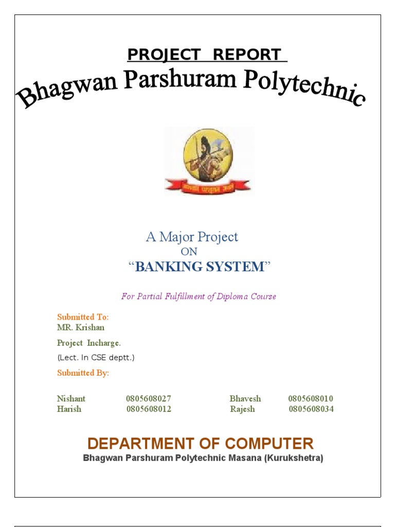 It is certified that all these Final year, Computer Engineering students of Bhagwan Parshuram Polytechnic MASANA(Kurukshetra) of Engineering & Technology have completed their major project BANKING SYSTEM successfully on time. I found them sincere & hardworking. Their performance during this project development period is excellent & I wish all of them successful carriers.