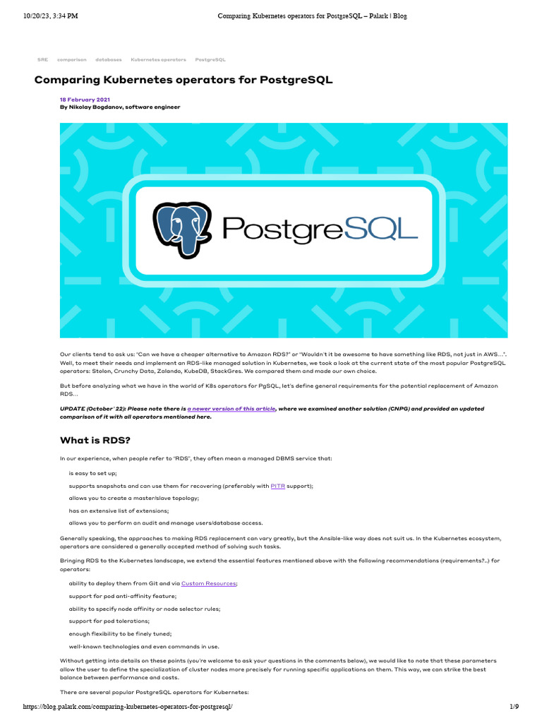 https://blog.palark.com/comparing-kubernetes-operators-for-postgresql/ 1/9