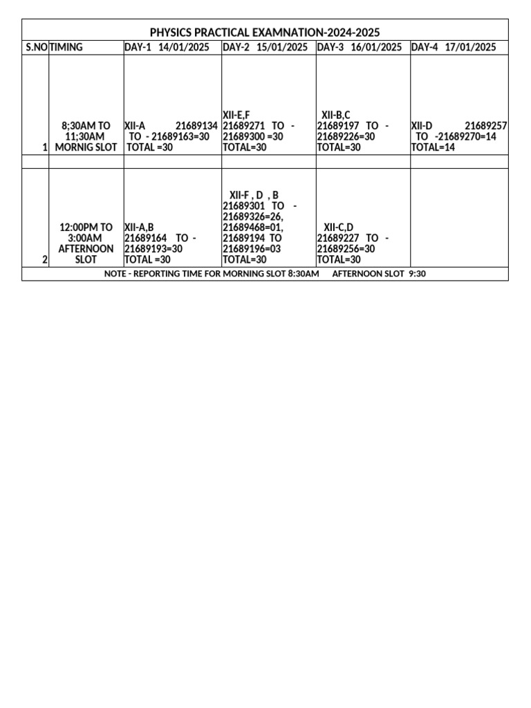 NOTE - REPORTING TIME FOR MORNING SLOT 8:30AM AFTERNOON SLOT 9:30