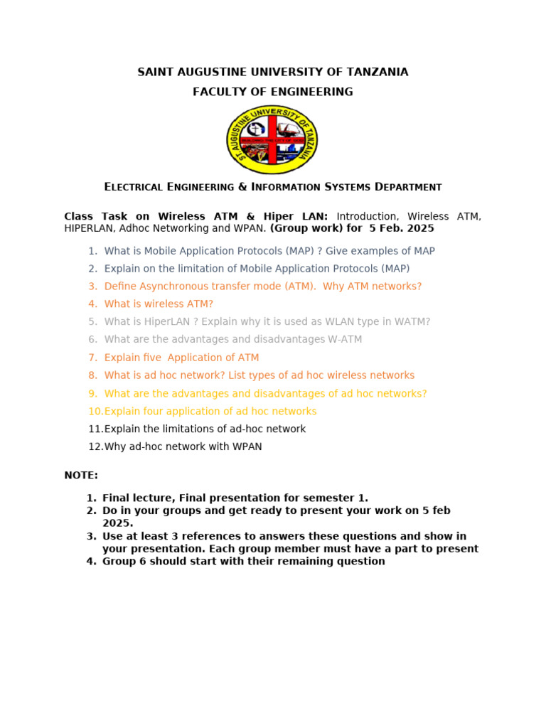 Class Task on Wireless ATM & Hiper LAN: Introduction, Wireless ATM,