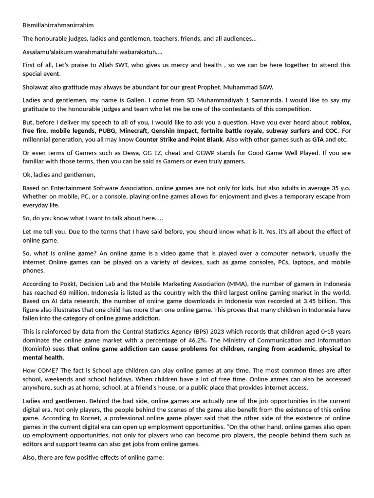 Ladies and gentlemen, my name is Gallen. I come from SD Muhammadiyah 1 Samarinda. I would like to say my