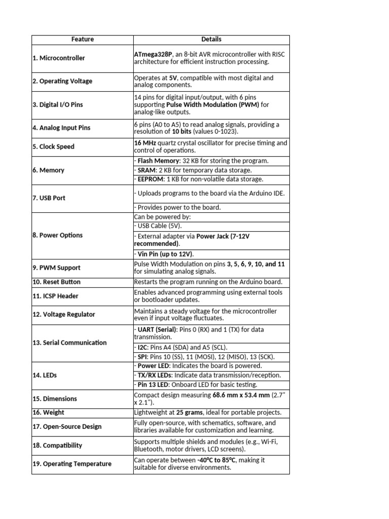 - I2C: Pins A4 (SDA) and A5 (SCL).