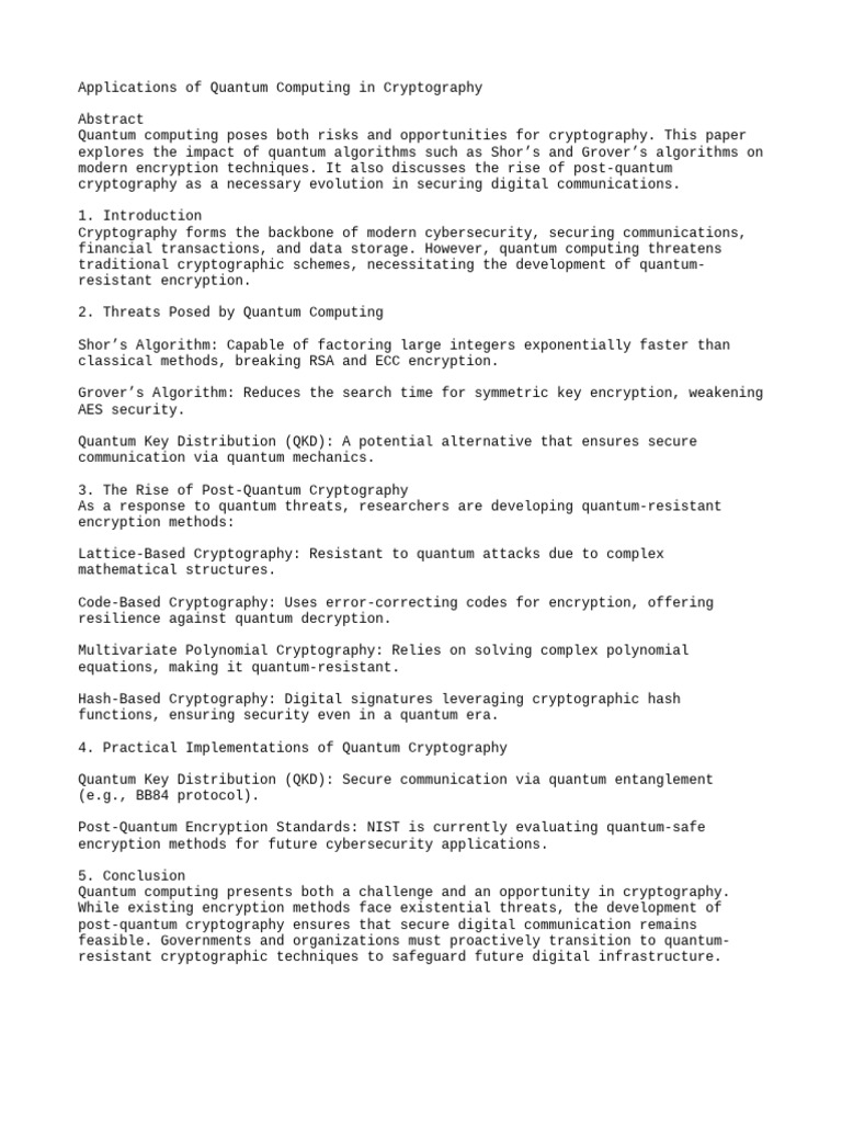 explores the impact of quantum algorithms such as Shor’s and Grover’s algorithms on