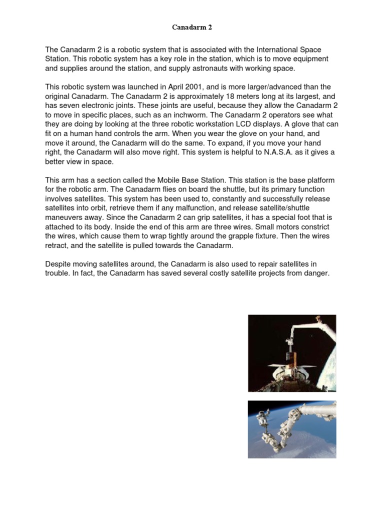 The way this arm is used is by having one crewmember operating the Canadarm from the flight deck control station, and the second crewmember usually assists with the camera operations. This robotic arm has drastically changed since the original. For example, unlike the original Canadarm, which is mounted outside the shuttle, the Canadarm 2 isnt tied down to a specific spot. Each end of this arm has a hand that will grab any of the necessary objects. In conclusion, the Canadarm 2 is perhaps one of the most well known Canadian accomplishments in space. Designed and built by the Canadian firm Spar Aerospace, the Canadarm was a gift from Canada to NASAs space shuttle program. Without this magnificent invention, we wouldnt have the ability to physically move/repair satellites by remote.