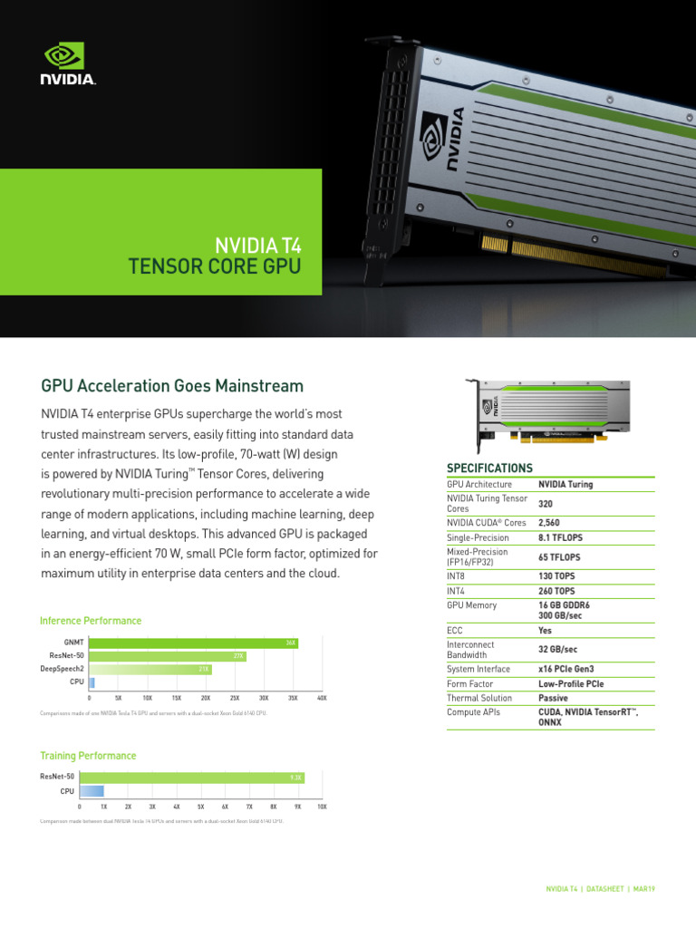 The small-form-factor, 70-watt (W) design The NVIDIA T4 data center GPU is the