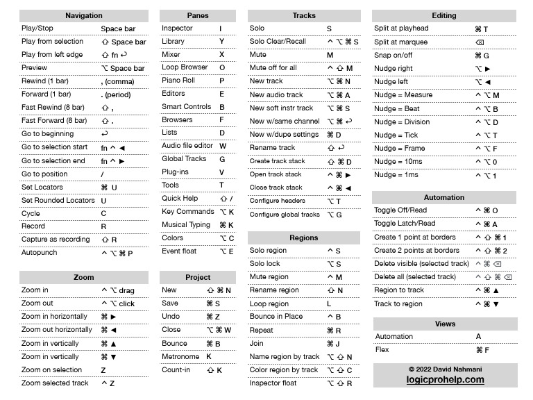 Rewind (1 bar) , (comma) Piano Roll P New track ⌥⌘N Nudge left ⌥◄
