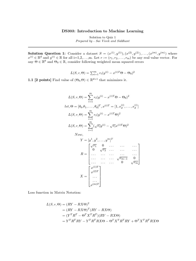 Solution Question 1: Consider a dataset S = (x(1) , y (1) ), (x(2) , y (2) ), . . . , (x(m) , y (m) ) where
