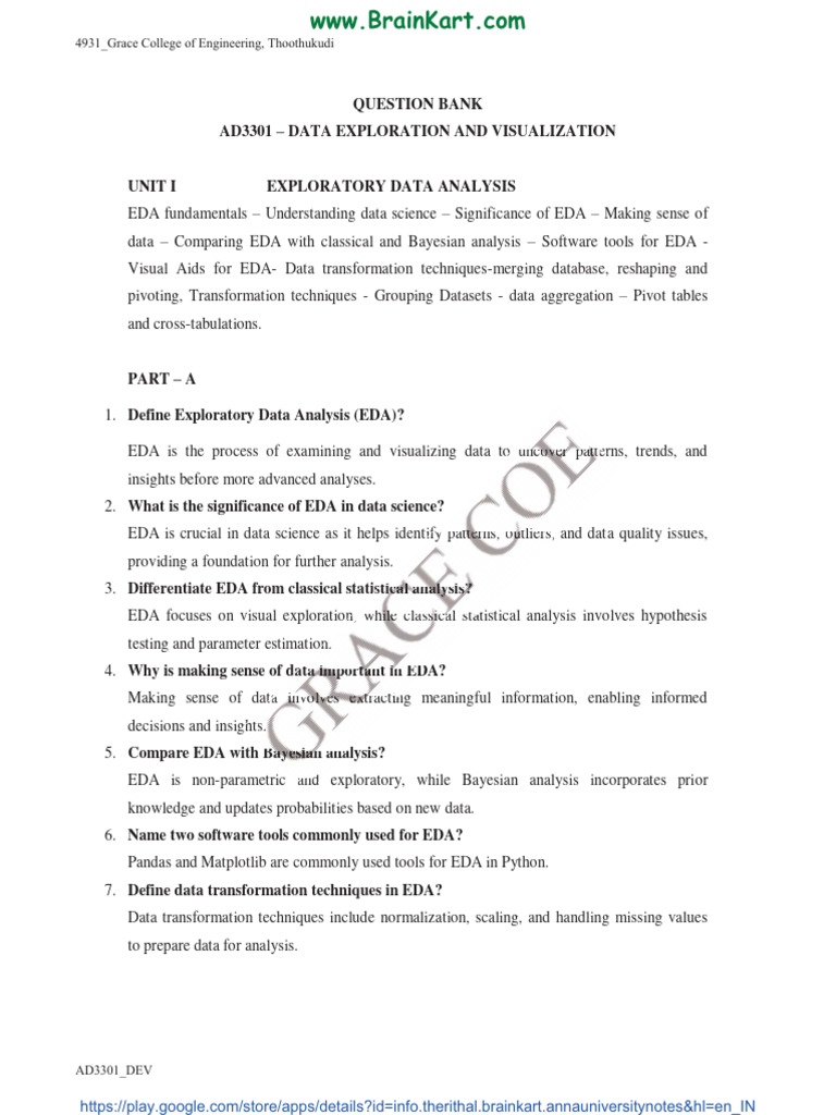 AD3301 ± DATA EXPLORATION AND VISUALIZATION