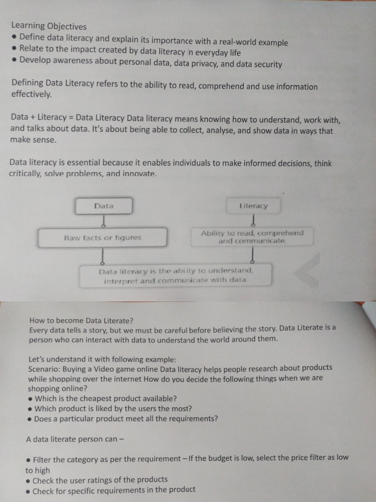 • Defin e data litera cy and explain its importan ce with a real-world example