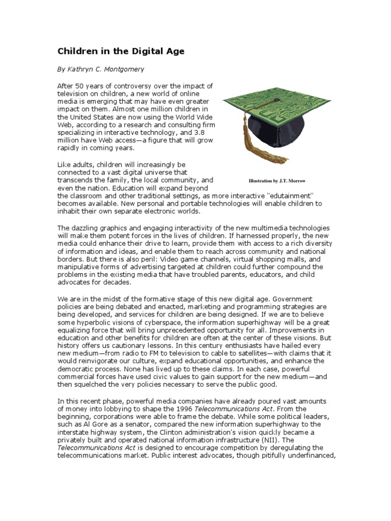 Source: Kathryn C. Montgomery: Children in the Digital Age, The American Prospect, No. 27, JulyAugust 1996. Reprinted with permission. Kathryn C. Montgomery, Ph.D., is co-founder and president of the Center for Media Education, based in Washington, D.C.