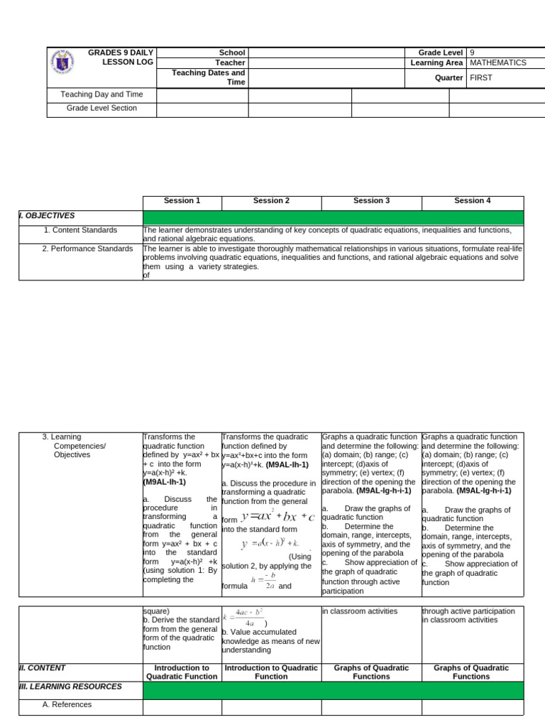 1. Content Standards The learner demonstrates understanding of key concepts of quadratic equations, inequalities and functions,