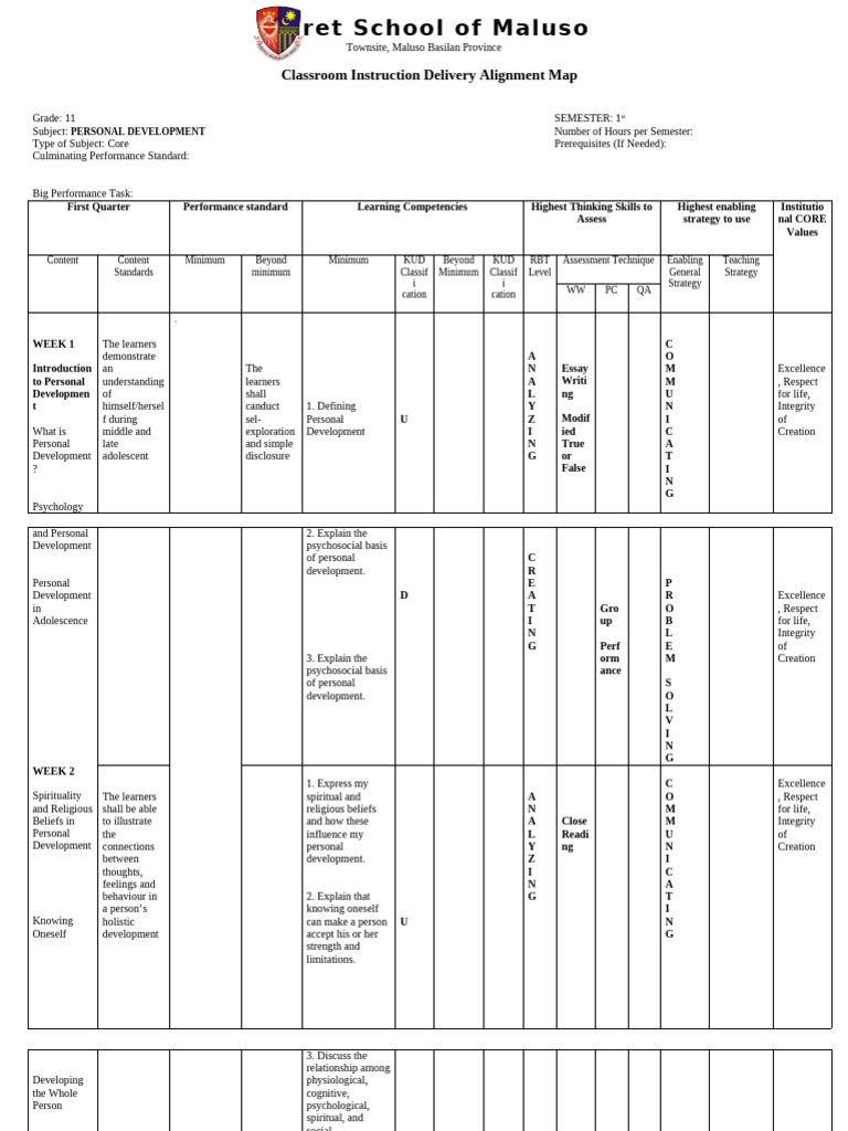 First Quarter Performance standard Learning Competencies Highest Thinking Skills to Highest enabling Institutio