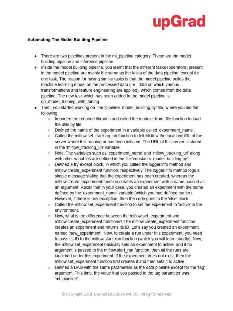 ● Inside the model building pipeline, you learnt that the different tasks (operators) present