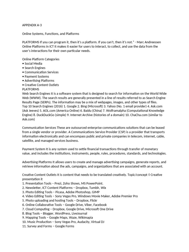 Online Systems, Functions, and Platforms