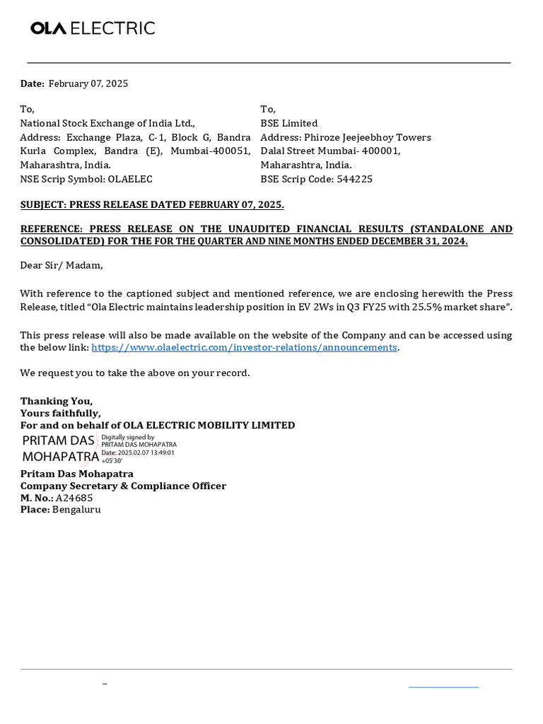the below link: https://www.olaelectric.com/investor-relations/announcements.