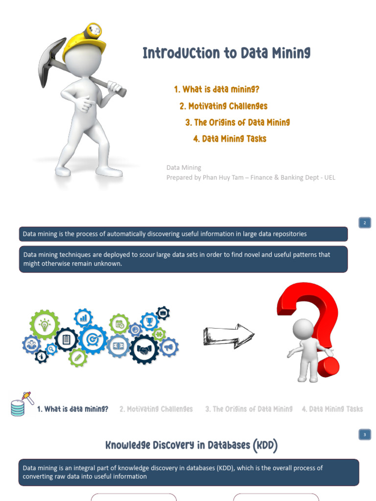 1. What is data mining? 2. Motivating Challenges 3. The Origins of Data Mining 4. Data Mining Tasks