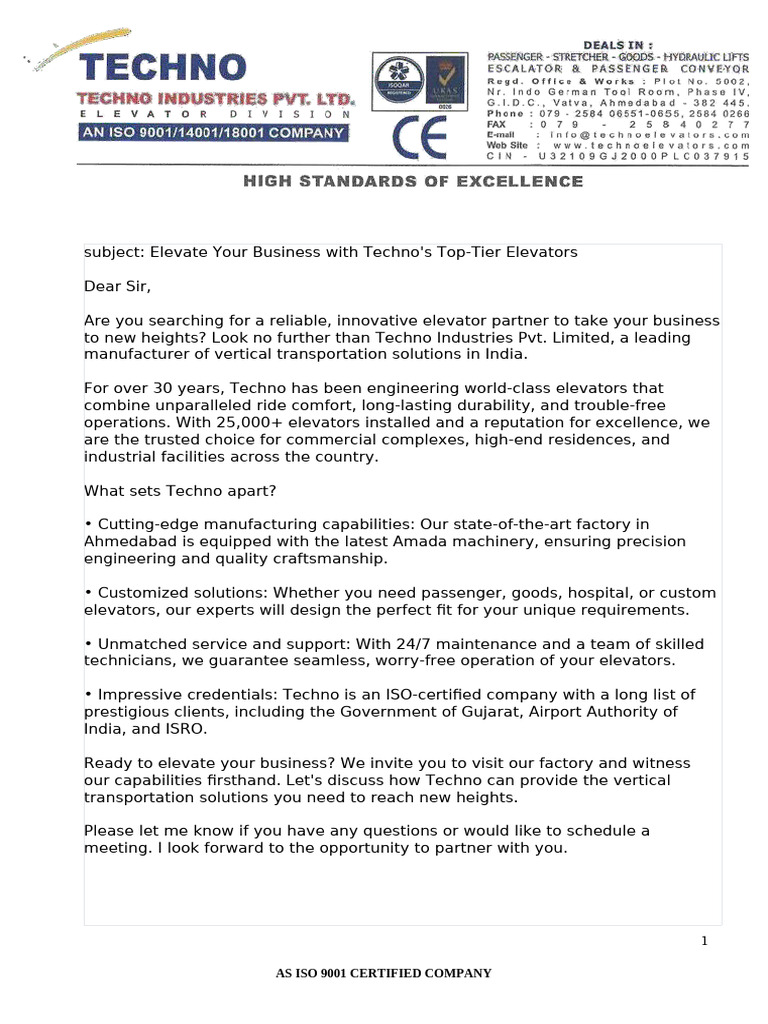 subject: Elevate Your Business with Techno's Top-Tier Elevators