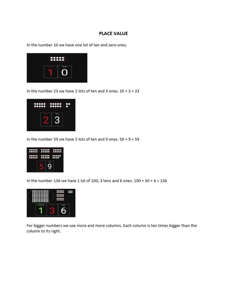 In the number 136 we have 1 lot of 100, 3 tens and 6 ones. 100 + 30 + 6 = 136