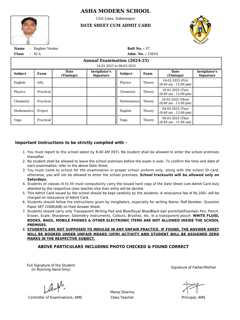 5. This Admit Card issued by the school should be kept carefully by the students. A reissuance fee of Rs.100/- will be