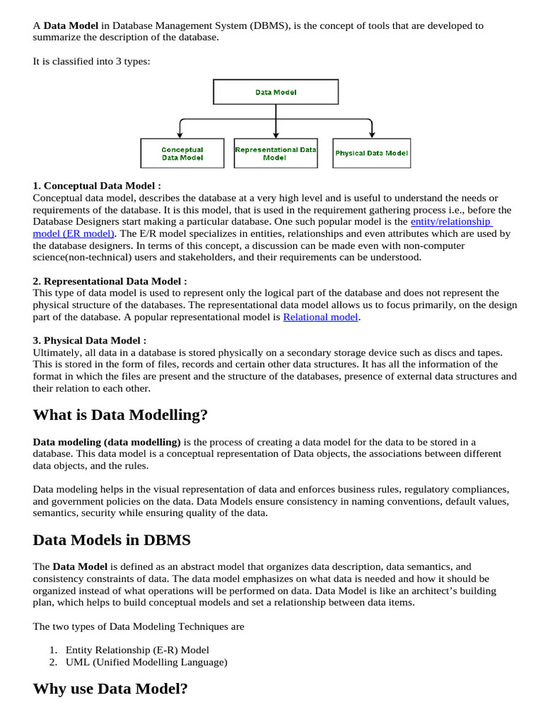 A Data Model in Database Management System (DBMS), is the concept of tools that are developed to