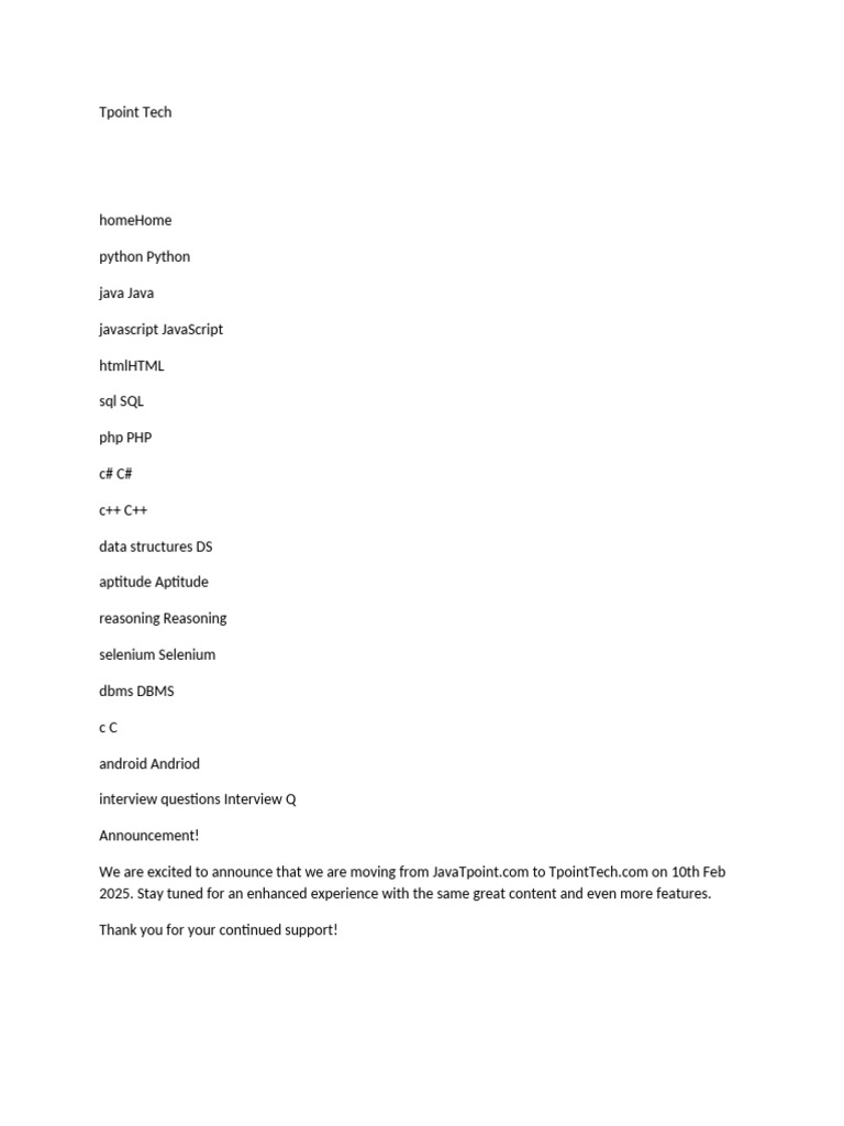 We are excited to announce that we are moving from JavaTpoint.com to TpointTech.com on 10th Feb