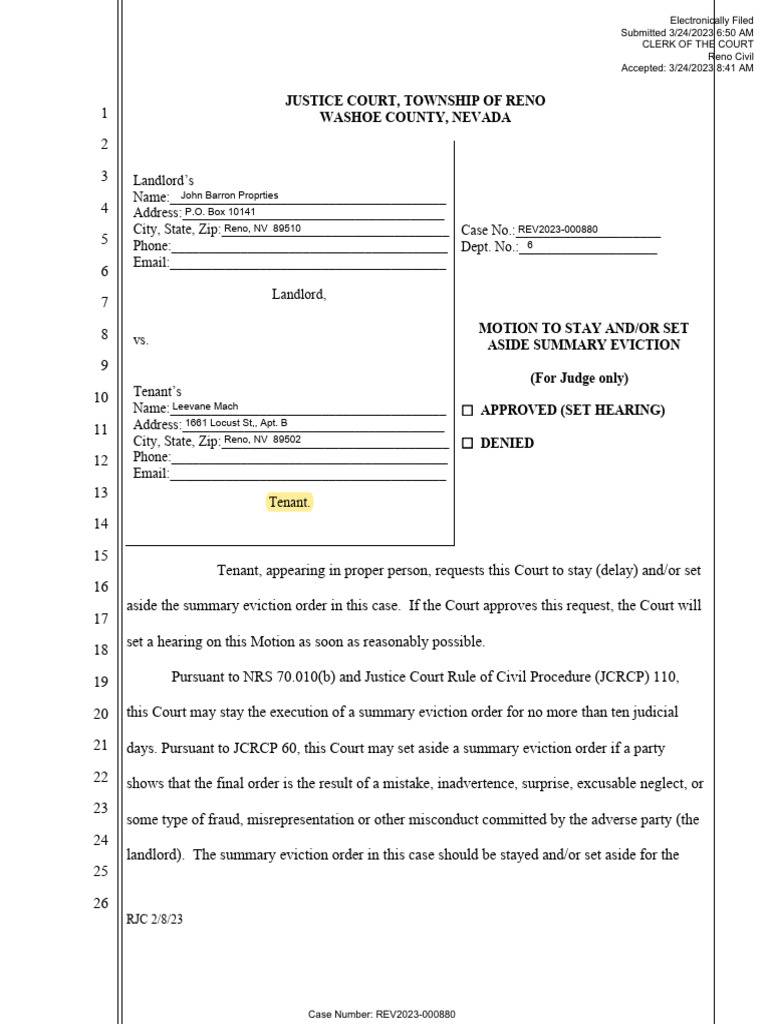 aside the summary eviction order in this case. If the Court approves this request, the Court will