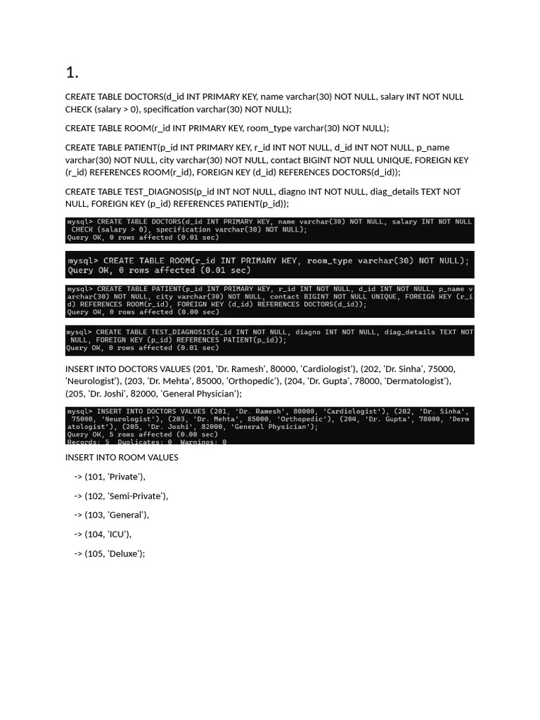 CREATE TABLE PATIENT(p_id INT PRIMARY KEY, r_id INT NOT NULL, d_id INT NOT NULL, p_name