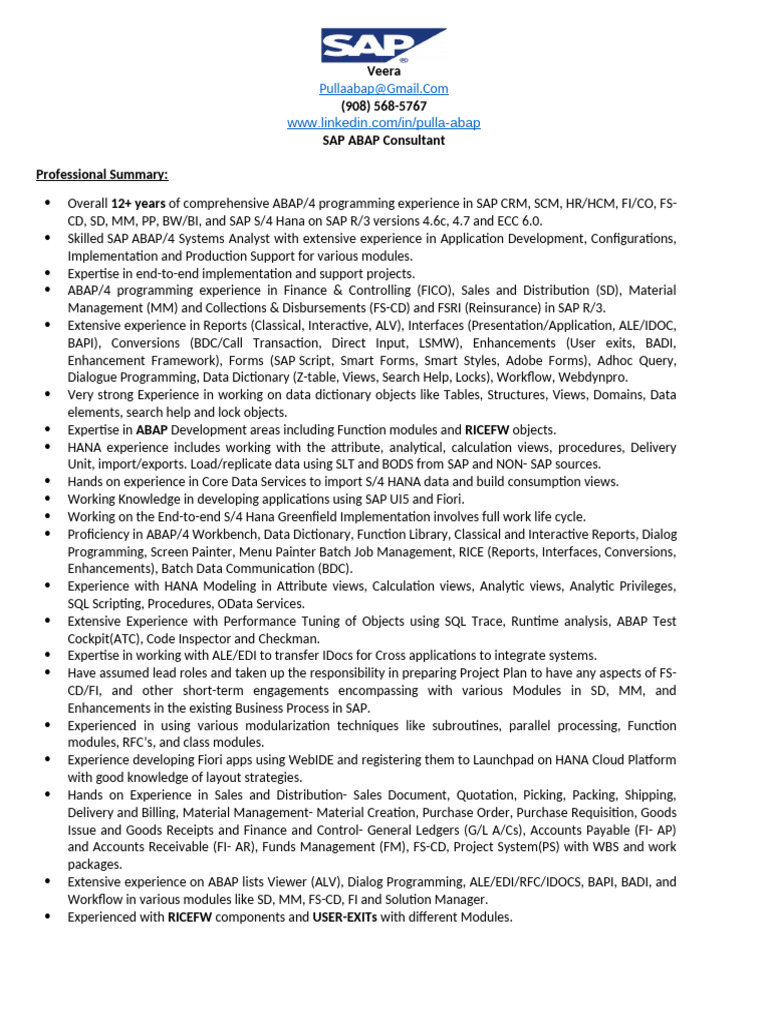 SAP Modules SAP-HR, SD, MM, FICO, PP, PI/PO, SCM, WM, FSCD, FI-GL.