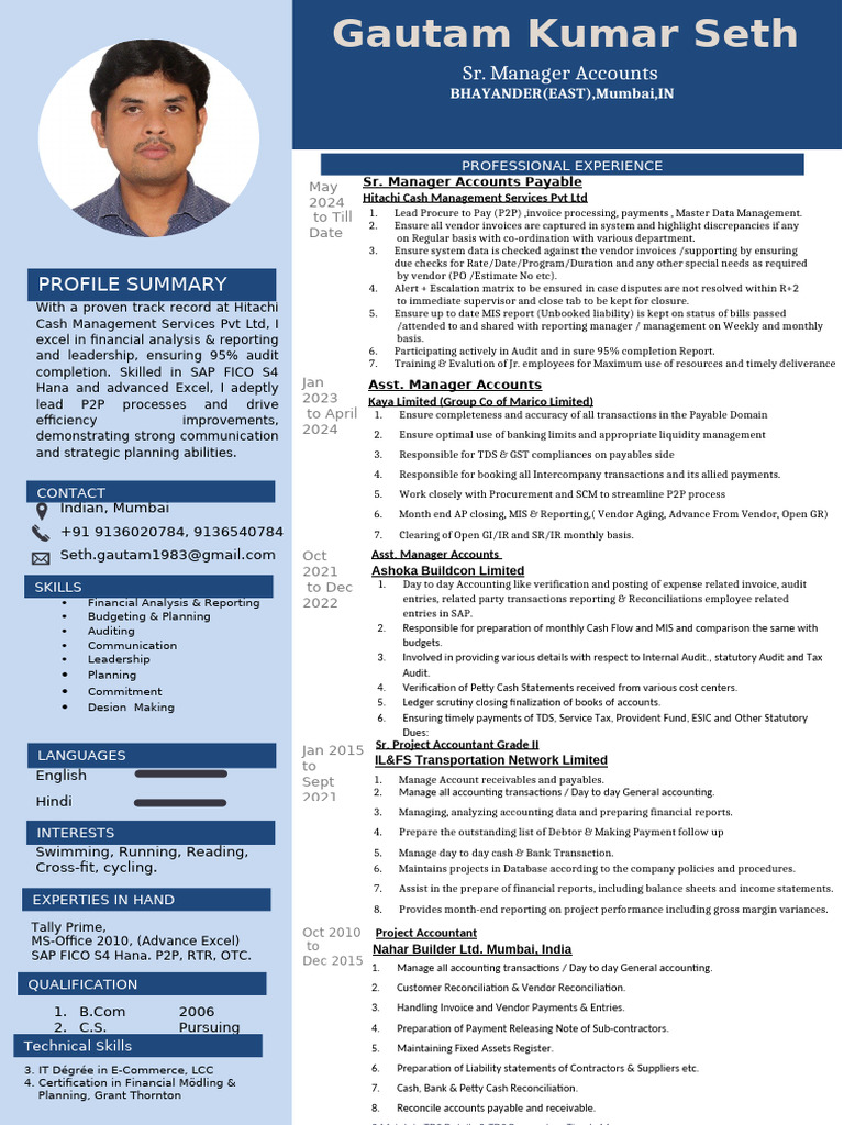 Indian, Mumbai 6. Month end AP closing, MIS & Reporting,( Vendor Aging, Advance From Vendor, Open GR)