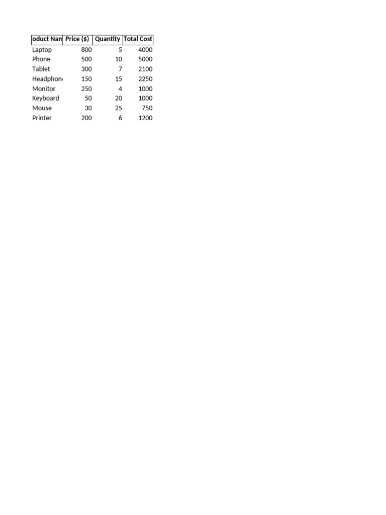 Product NamePrice ($) Quantity Total Cost