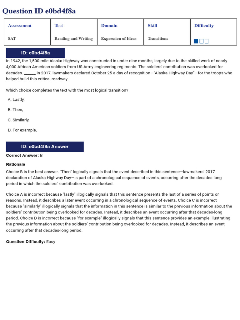 period. Choice D is incorrect because "for example" illogically signals that this sentence provides an example illustrating