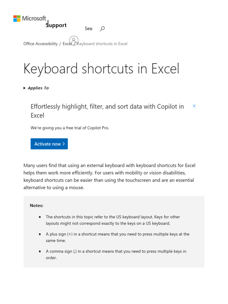 Office Accessibility / Excel / Keyboard shortcuts in Excel