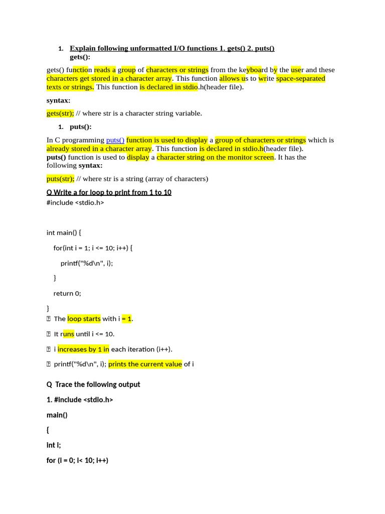 1. Explain following unformatted I/O functions 1. gets() 2.