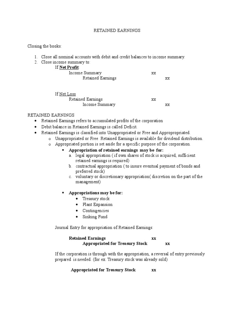 • Retained Earnings is classified into Unappropriated or Free and Appropropriated.